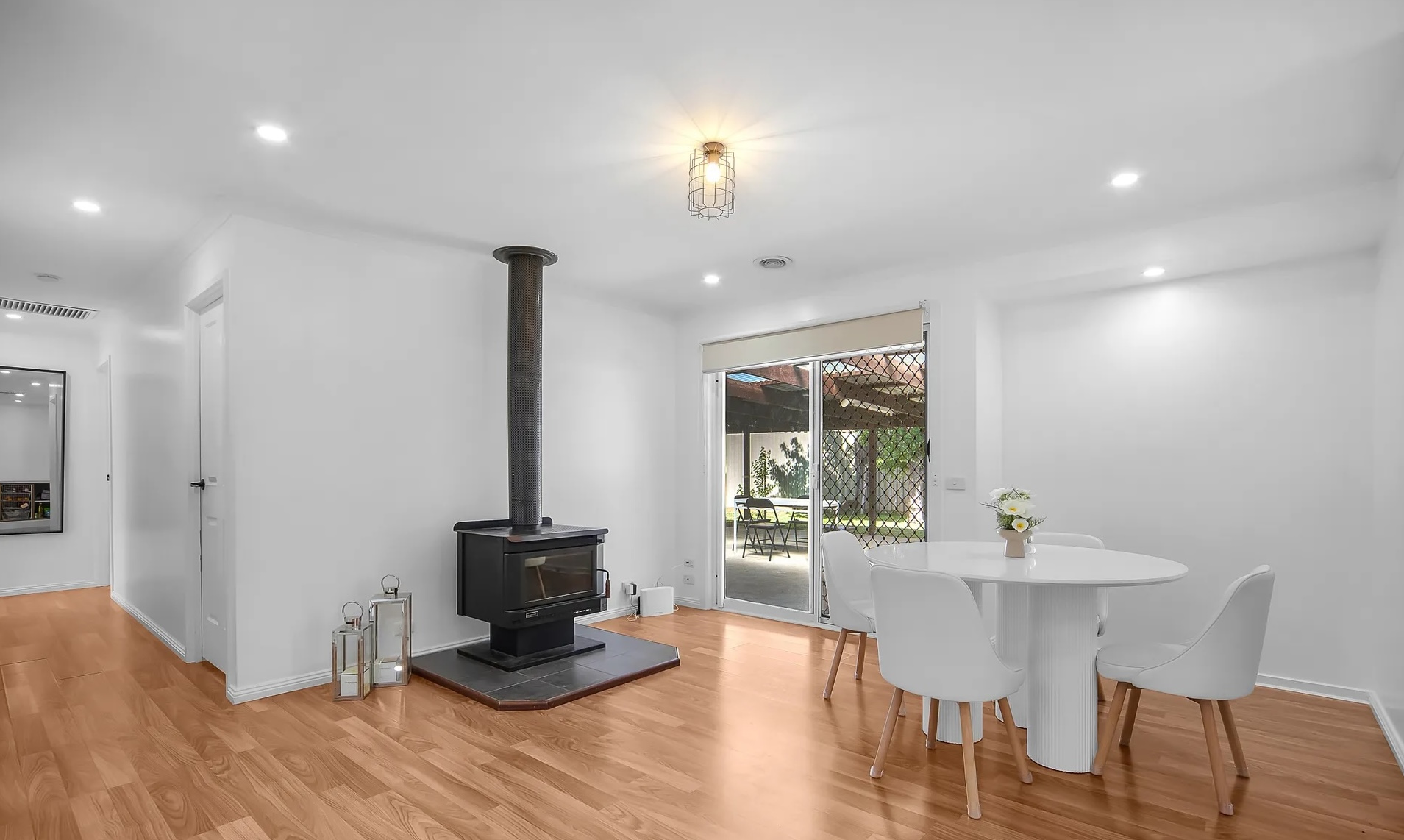 The home features a well-equipped kitchen complete with modern appliances including a dishwasher, ample storage, a central bathroom, plus a private ensuite to the main bedroom. Light-filled living areas create a welcoming atmosphere, complemented by a cosy wood heater and the added comfort of ducted heating and cooling throughout.